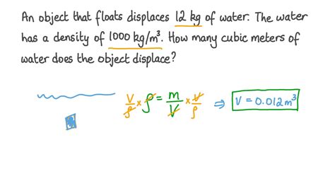 In another example, consider a ship floating in water. The ship displaces a volume of water equal to its own weight. If the ship's weight is 10,000 tons, it will displace 10,000 tons of water. The volume of the displaced water can be calculated using the density of water (approximately 1,000 kg/m³) and the weight of the ship.